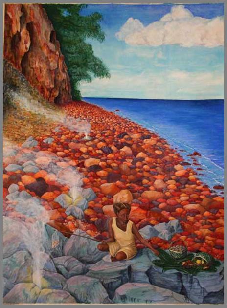Text Box: Megapode birds like to lay their eggs in the warm soil of active volcanoes.  High on the slopes of Simbo Island we collected a few for lunch and descended to the shore to cook them on the vent of the volcano, together with sweet potatoes and green vegetables.